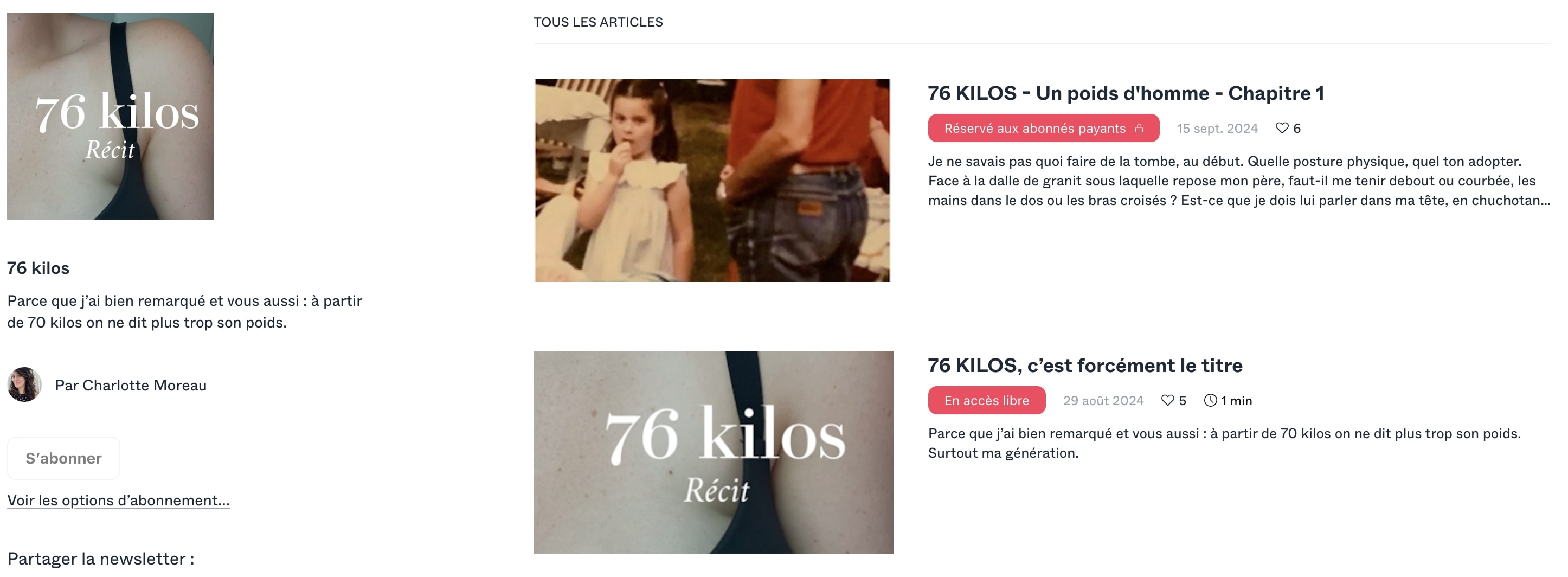 Si vous souhaitez découvrir « 76 kilos », rendez-vous sur cette page, où vous pourrez lire l’intro, le début des chapitres à leur parution, et découvrir les options d’abonnement. Chaque abonnement inclut un essai gratuit de 30 jours.